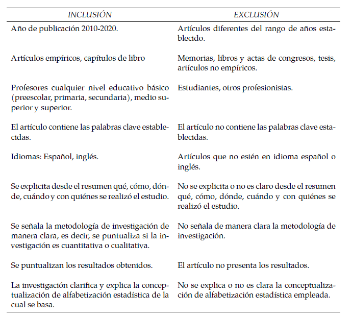 Cabe destacar que la relevancia de esta investigación se hace evidente dado que solo se encontró un estudio de revisión sistemática relacionada con la alfabetización estadística, el cual se centra en el desarrollo de las habilidades de alfabetización estadística de los estudiantes, y fue publicado por Aziz y Rosli (2021). En este estudio se analizaron 36 artículos que se enfocan en la temática de interés, obteniendo como resultado principal la identificación de los métodos de enseñanza que influyen en el desarrollo de la competencia estadística entre los estudiantes. De acuerdo con la revisión de la literatura realizada, no se encontró ninguna revisión sistemática centrada en los docentes.