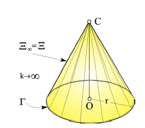 Consideremos una pirámide recta de base el polígono regular , e imaginemos que el número de lados del polígono base se hace cada vez más grande, es decir, ,ante esa perspectiva la base, en su situación límite, se convierte en una circunferencia mientras que las caras y aristas de la pirámide aumentan hasta determinar una superficie suave, un cono con su vértice en la cúspide C de la pirámide , que escribiremos como (Figura 9). Para entender los procesos infinitos en el cono se debe imaginar que, cuando , las caras de la pirámide adquieren una suavidad que conlleva a la superficie lateral del cono. Pero ante todo, no se debe confundir la situación límite con el proceso infinito, por más caras que se le agreguen a la pirámide nunca podría encajar en la superficie de un cono, se está todavía en el proceso infinito, mientras que la superficie del cono es la situación límite; veamos esto con más detalle.