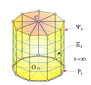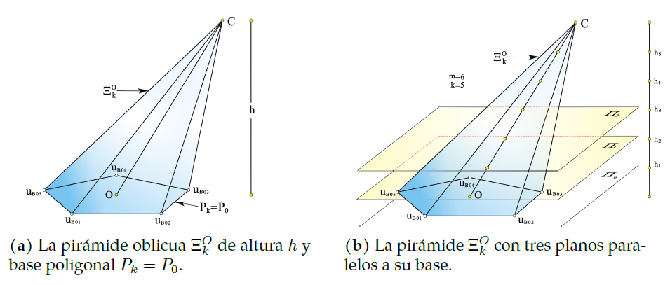 Para comenzar, considérese una pirámide oblicua, , de altura h, base el polígono regular , , , cúspide C y centro de la base O (Figura 6a). Al considerar la altura h de la pirámide se ve que si se divide en m partes iguales, , esto es: , entonces la línea OC, tanto como las aristas también quedan divididas en el mismo número de partes, según el teorema de Thales, aunque no de longitud (Figura 6b). Bajo esta nueva perspectiva la idea es aproximar la pirámide oblicua mediante una torre, de prismas, , que llamaremos prismas internos, y cuya suma de volúmenes es menor que el de la pirámide, y de otra torre, , que exceda a en volumen, constituida de prismas , que llamaremos prismas externos, donde nuevamente j representa el número de prismas contados de O a C; , para la torre interna y para la externa, siendo k es el número de lados del polígono base , .