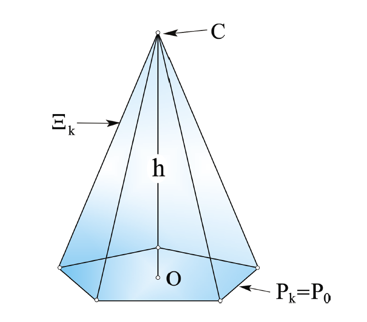 Considérese un polígono regular Pk de y longitud de lado L, mediante este polígono se puede construir una pirámide recta, Ξk, de base poligonal Pk, altura h, cúspide C y centro de la base O (Figura 1). Para determinar el volumen, V (Ξk), de la pirámide Ξk, se realizan dos aproximaciones, una con prismas internos y otra con externos, estos prismas constituyen dos torres, una interna y otra externa, que delimitan el volumen de la pirámide, luego, se calcula el factor de semejanza por medio de triángulos semejantes que son construidos al trazar la diagonal entre dos vértices opuestos de los polígonos tapa o base junto con las aristas de la pirámide y se comparan las bases de los triángulos con la base del triángulo más grande, iniciando con casos particulares hasta generalizar el factor de semejanza, veamos cómo puede ser esto con más detalle.