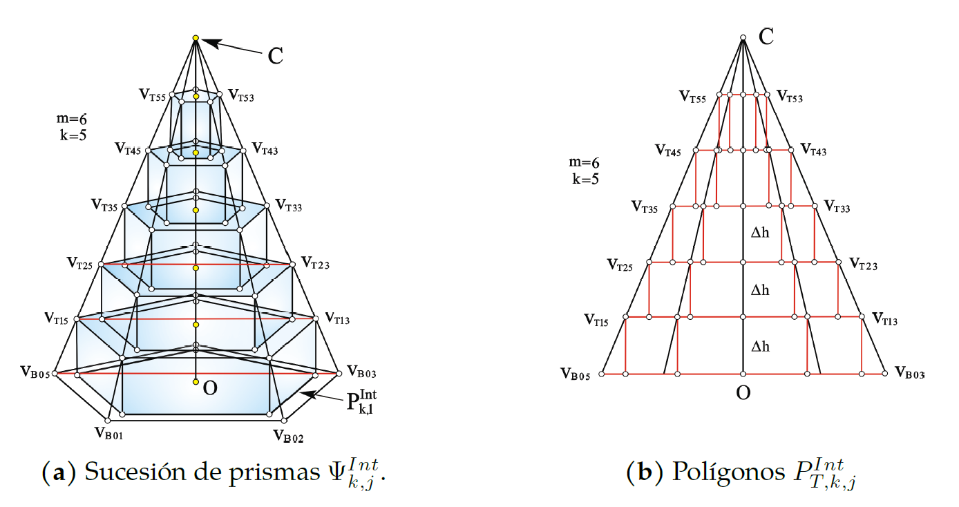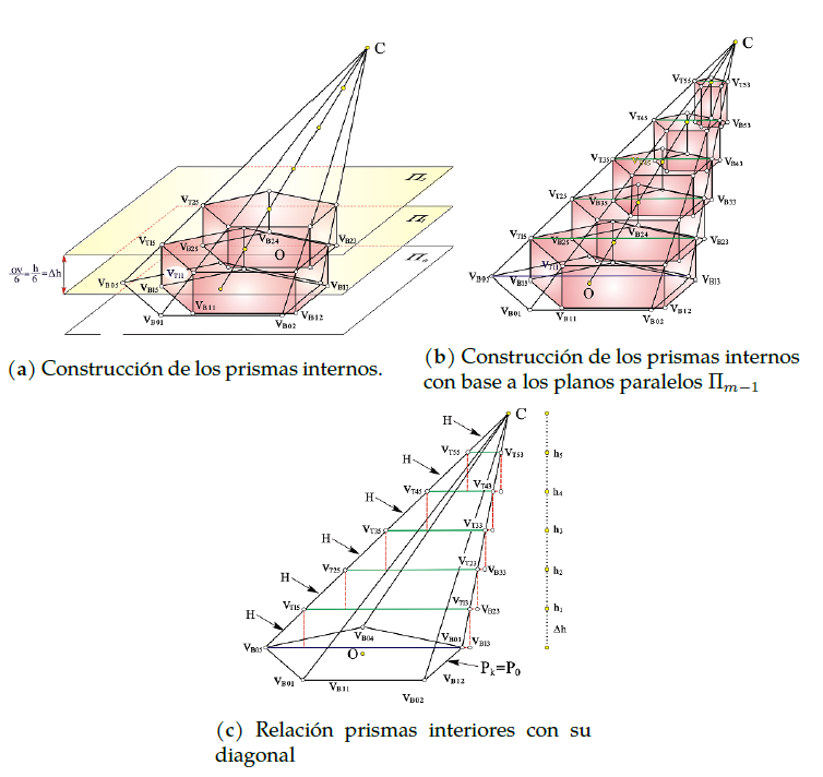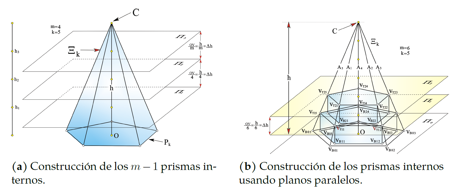 Para construir los prismas, tanto internos como externos, se utilizan los m-1 planos, , paralelos al plano de la base y que pasan por los puntos , que dividen a h en m partes iguales. En el caso del primer prisma interno, , se determinan las intercepciones del primer plano, , con las k aristas de la pirámide, esto fija los puntos: , si es que m=6, configurando el polígono tapa, , del prisma, . Después, los puntos, , se proyectan ortogonalmente al plano base, , donde determinan los puntos , de la base, , del primer prisma, estos puntos, conjuntamente con los vértices , delimitan al primer prisma (Figura 7a).