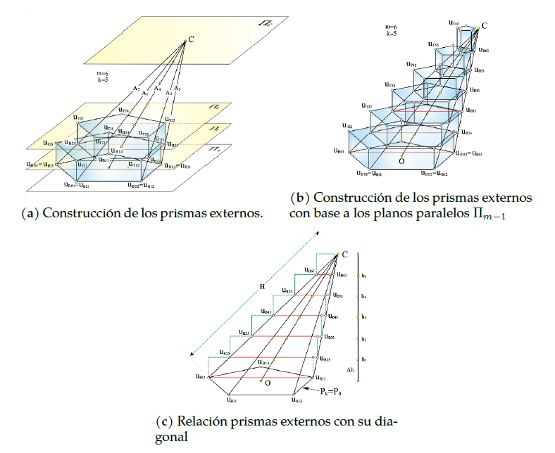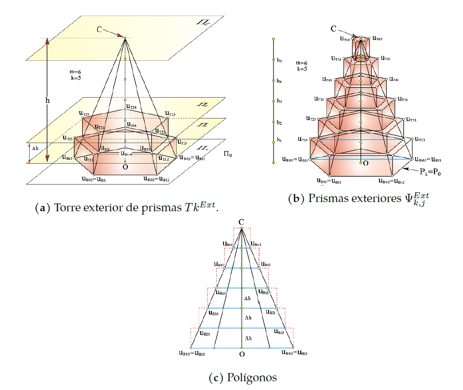 Para construir el segundo prisma exterior, , se consideran las intersecciones del plano con las k aristas, , de la pirámide , esto fija a los puntos; , que se proyectan ortogonalmente sobre el plano , esto determina a los puntos: , que delimitan un polígono congruente al que constituyen los puntos: . Estos diez puntos constituyen un prisma que nuevamente, la tapa, queda por fuera de la pirámide. Este proceso se repite para la construcción de los m prismas exteriores, , siendo que las tapas se encuentran a alturas, del plano de la base de la pirámide, donde j indica el número del prisma, contados de O a C (Figura 4b).
