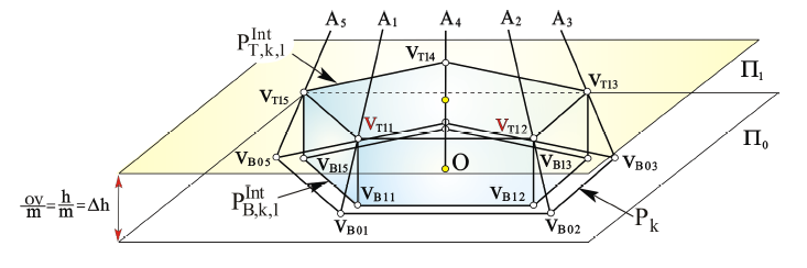 Para el caso del segundo prisma, , se procede en forma análoga, es decir, se encuentran las intersecciones del segundo plano, , con las aristas, , , estos puntos son: , que determinan un polígono semejante al de la base de la pirámide , obteniendo la tapa del segundo prisma, esto es: . Luego, estos puntos se proyectan ortogonalmente sobre el plano anterior que resulta ser , así se determinan los k vértices de un nuevo polígono, , los polígonos, tapa, , y base, , determinan al segundo prisma interior, ; en forma similar se construyen los demás prismas interiores, , , utilizando los planos paralelos (Figura 7b).