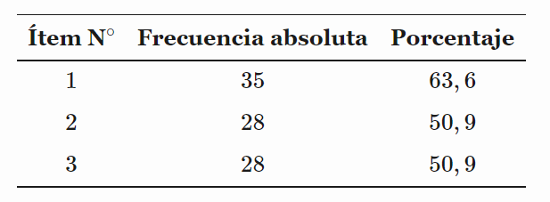 En la Tabla 1 se presentan las frecuencias absolutas y porcentajes de respuestas correctas obtenidas en los ítems del cuestionario.