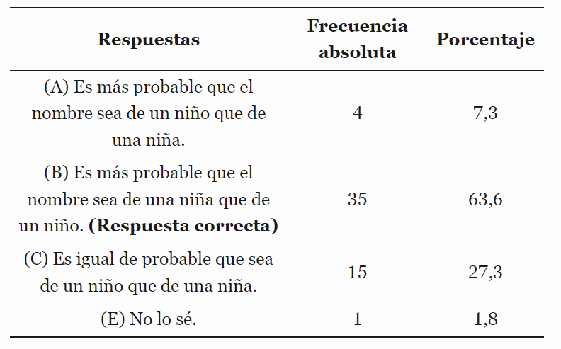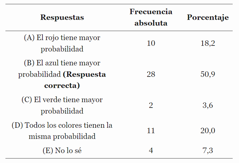En este ítem se encuentra cierta similitud con los porcentajes obtenidos para cada opción en los estudios de Green y Cañizares; por ejemplo, si se suman los porcentajes de las opciones (A) y (C) que indican un posible argumento asociado al efecto de “recencia” (positiva y negativa, respectivamente) en este estudio se obtiene 21,8% de respuestas y en Cañizares (1997) y Green (1982), respectivamente 19,0% y 17,6%. Sin embargo, en el presente estudio se obtiene un menor porcentaje (20,0%) en el distractor (D), asociado al enfoque en el resultado o al sesgo de equiprobabilidad, respecto al obtenido por Green (1982), el cual fue 38,0%.