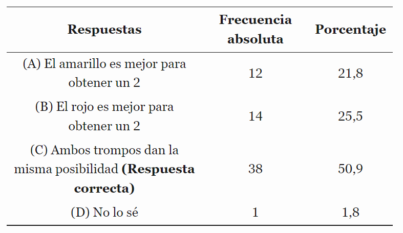 Al planificar la enseñanza de contenidos probabilísticos, los estudiantes, incluso con instrucción, pueden verse afectados por creencias sesgadas que llevan a distorsionar la información que se les presenta y provocar errores sistemáticos en la resolución de problemas probabilísticos (Jones y Thornton, 2005). Según indica Chaves (2016, p. 30) “resulta de fundamental importancia que el docente valore aspectos de carácter emotivo (creencias, intuiciones y actitudes) que puedan afectar el aprendizaje de los conocimientos disciplinares”. Por lo tanto, es necesario que el docente considere las intuiciones previas de los estudiantes, algunas de las cuales, según Fischbein (1987), pueden ser incorrectas y generar obstáculos en su aprendizaje. Se debe ayudar a distinguir sus creencias intuitivas sesgadas de los razonamientos correctos, que pueden ser reforzados con la enseñanza, mediante la cual se adquiere un sustento teórico.