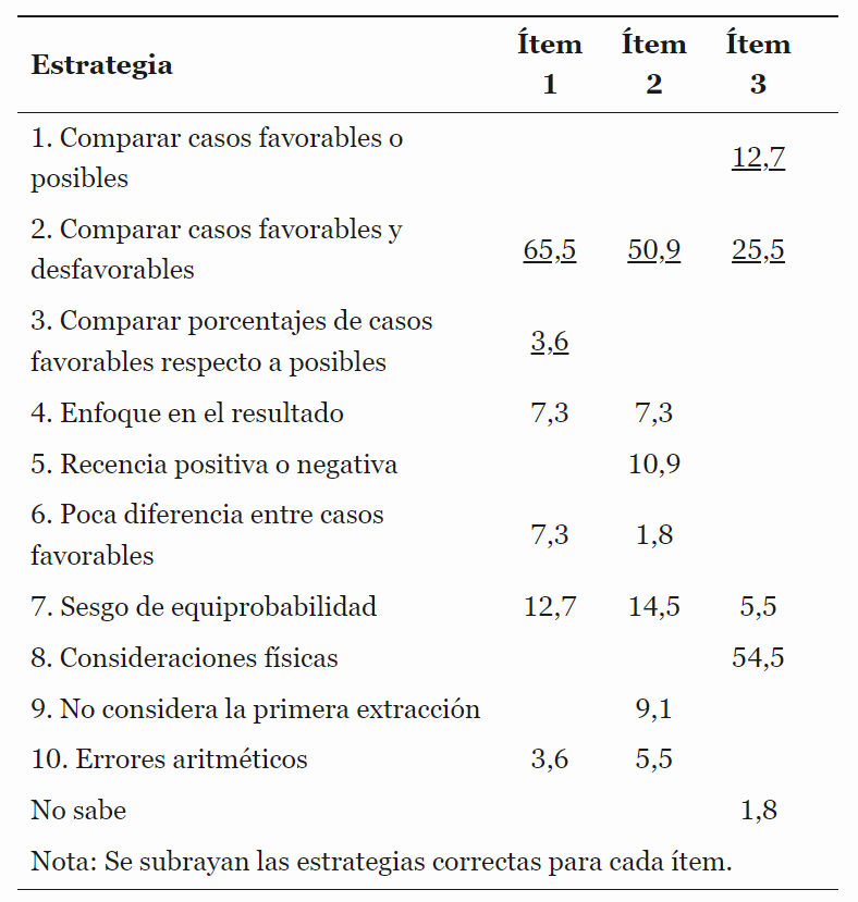 Debido a que los ítems 1 y 2 no requieren razonamiento proporcional, sino una comparación de casos favorables, una indebida asociación intuitiva entre aleatoriedad y equiprobabilidad puede incidir en este tipo de argumentos. Cañizares (1997) encontró que en el ítem 2 solo 8,4% de los estudiantes de la muestra indicaban equiprobabilidad, debido a que la diferencia entre las cantidades de bolas es muy pequeña, y por tanto no influye significativamente en la comparación de probabilidades. En este estudio solo cuatro estudiantes presentaron este sesgo en el ítem 1 y sólo uno en el ítem 2; sin embargo, es necesario que el docente considere este aspecto a la hora de proponer tareas donde la cantidad de casos favorables entre eventos sea parecida.