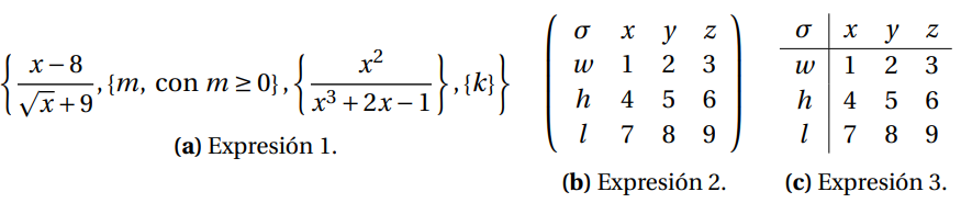 \({\displaystyle{\left\{\frac{x-8}{\sqrt{x}+9},\left\{{m,\text{ con } m\geq 0}\right\},\left\{{\frac{x^2}{x^3+2 x-1}}\right\},\left\{{k}\right\}\right\}}}\)