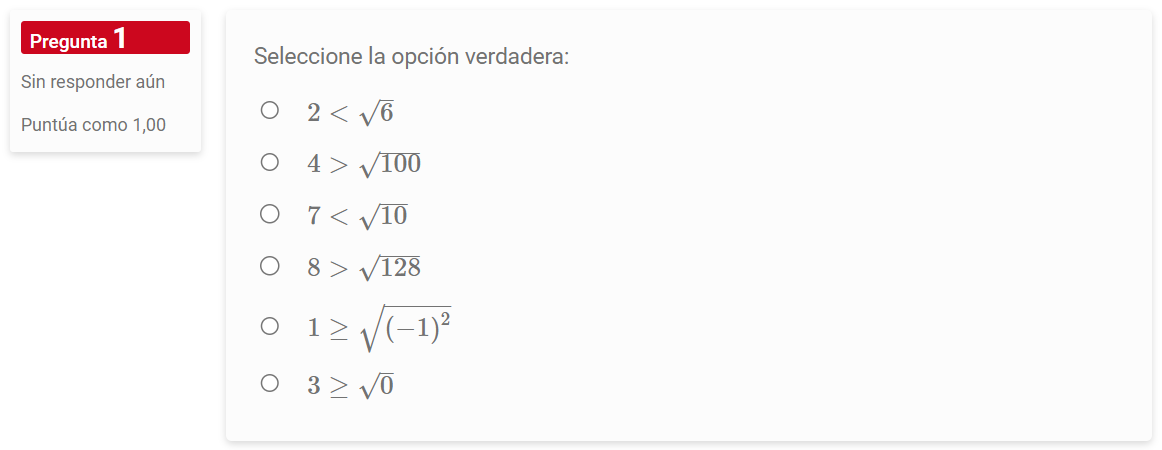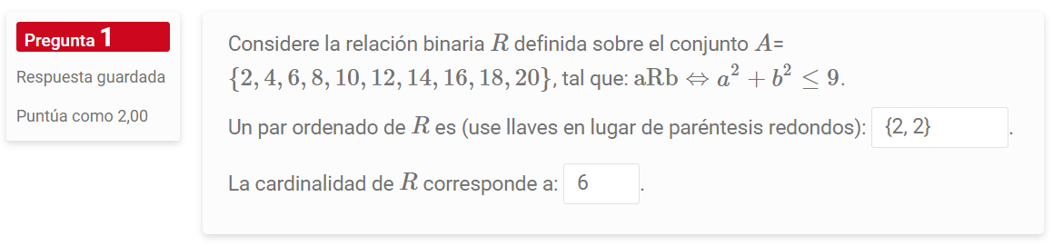 Considere la relación binaria ({\displaystyle{R}}\) definida sobre el conjunto \({\displaystyle{A}}\)= \({\displaystyle{\left\{2, 4, 6, 8, 10, 12, 14, 16, 18, 20\right\}}}\), tal que: \({\displaystyle{\text{aRb} \Leftrightarrow a^2+b^2\leq 9}}\). Un par ordenado de \({\displaystyle{R}}\) es (use llaves en lugar de paréntesis redondos): {1:SA:~={2, 2\}#Excelente~={2, 4\}#Excelente~={2, 6\}#Excelente~={4, 2\}#Excelente~={4, 4\} #Excelente~={6, 2\}#Excelente~={2,2\}#Excelente~={2,4\}#Excelente~={2,6\}#Excelente~={4,2\} #Excelente~={4,4\} #Excelente~={6,2\}#Excelente}. La cardinalidad de \({\displaystyle{R}}\) corresponde a: {1:SA:~=6#Excelente}