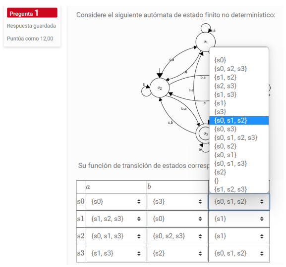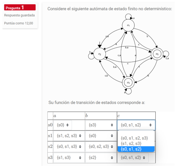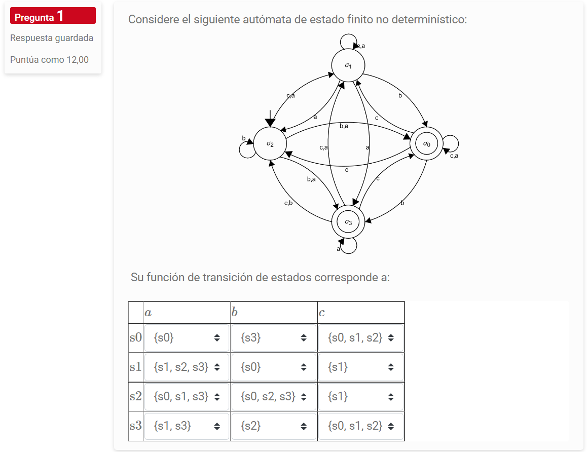 Ejemplo 18. Elabore una pregunta incrustada que muestre el diagrama de transición de un autómata de estado finito no determinístico con cuatro estados y tres símbolos de entrada, donde se solicite como respuesta su función de estado siguiente.
