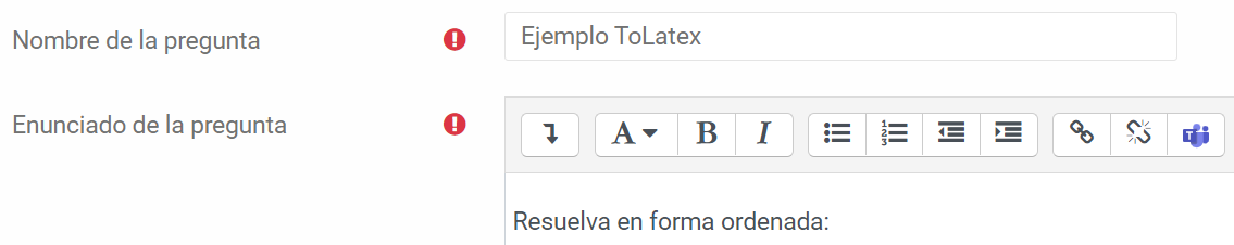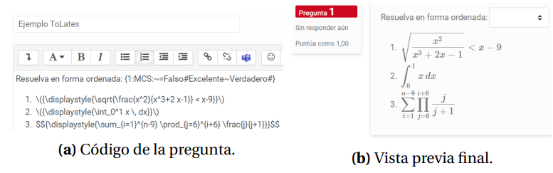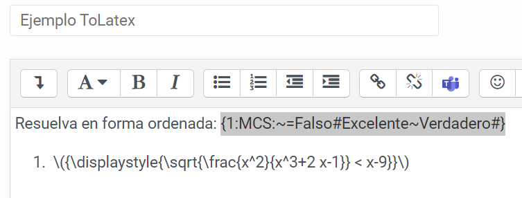 El manejo de código LaTeX dentro de la plataforma de aprendizaje Moodle para crear enunciados en un cuestionario online, puede implicar un conocimiento previo sobre el uso de este sistema de composición de textos de alta calidad tipográfica, que algunas veces no se tiene o se posee parcialmente por parte del profesor, dificultando la edición y diseño de las evaluaciones requeridas. Pensando en estas posibles limitaciones, se elaboró, dentro del paquete “Incrustada”, el comando “ToLatex” cuyo propósito se describe en la siguiente ficha: