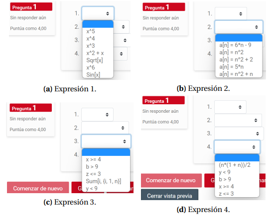 En la figura 10 se muestran las distintas formas de respuesta con formato desplegado, al pegar cada vez en el área de edición de la pregunta en Moodle (una por cada Out[ ] obtenido). Cabe destacar que el “=” no se puede utilizar directamente en la instrucción “Desplegada” (lo mismo sucede con otros comandos de “Incrustada”), en su lugar, se emplea el “==”. También, se observa que el atributo “evaluar ->True” literalmente permite que Wolfram Mathematica evalúe cada una de las opciones de respuesta. En este ejercicio se facilitó el cálculo de la sumatoria a través de una fórmula.