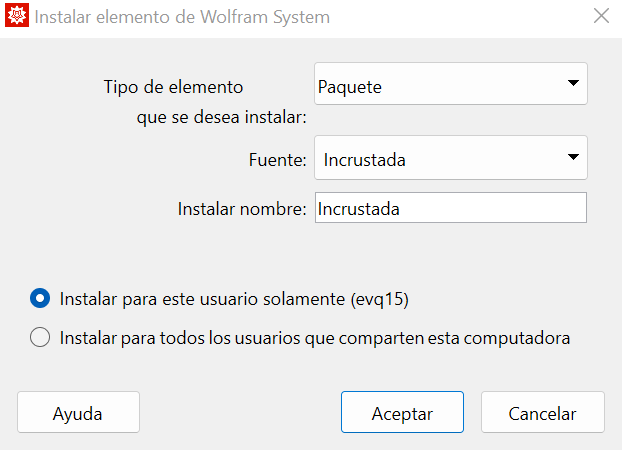 La instalación del paquete “Incrustada” ya habiendo descomprimido el archivo “Incrustada.m”, se realiza en Wolfram Mathematica desde el menú Archivo/Instalar.