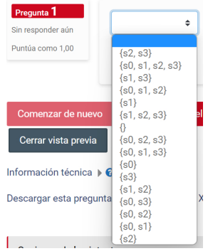 Ejemplo 4. Construya una respuesta desplegada con todos los subconjuntos de. Asuma los subconjuntos ordenados de menor a mayor de acuerdo a su cardinalidad, tomando a los primeros seis como las opciones correctas.