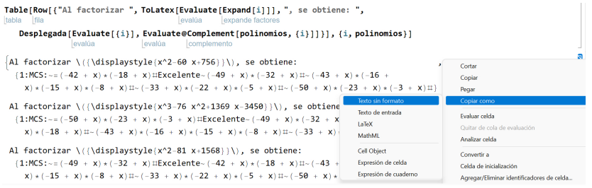 La sentencia “ToLatex” del paquete “Incrustada” convierte expresiones escritas en un cuaderno de Wolfram Mathematica a código LaTeX de la plataforma Moodle. La ayuda de esta instrucción en Wolfram nos brinda una descripción sobre su uso y opciones disponibles: