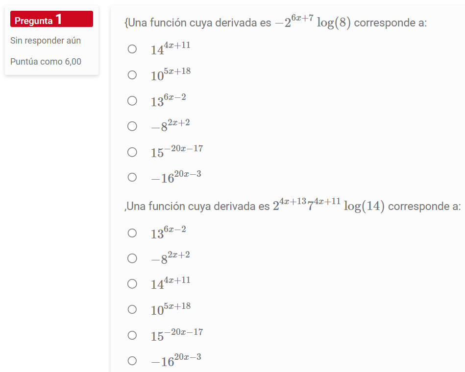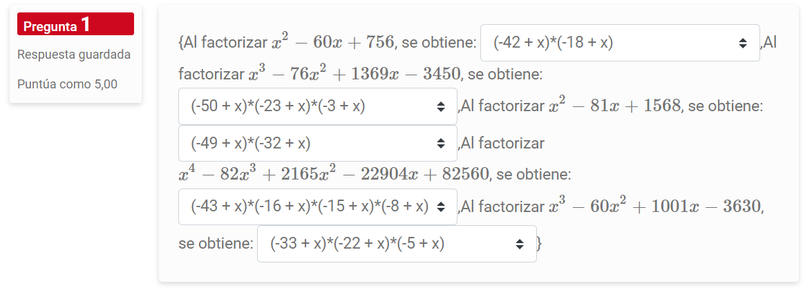 Genere mediante la instrucción “ToLatex” el siguiente enunciado para una pregunta con respuestas cloze en Moodle.