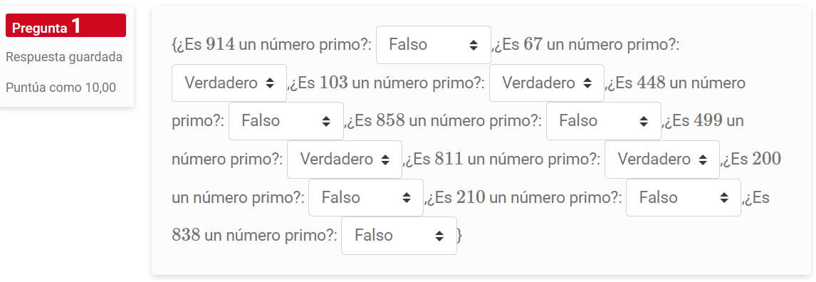 En la figura 22 aparece lo devuelto por la plataforma de aprendizaje, al copiar sin formato la celda del Out[ ] anterior y pegar en el espacio de edición de la pregunta en Moodle. Naturalmente, esta salida es pseudoaletaoria por lo que el lector podría obtener otro resultado al ejecutar el In[ ].
