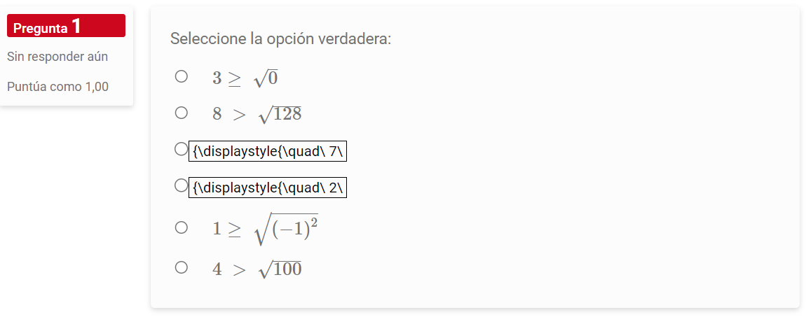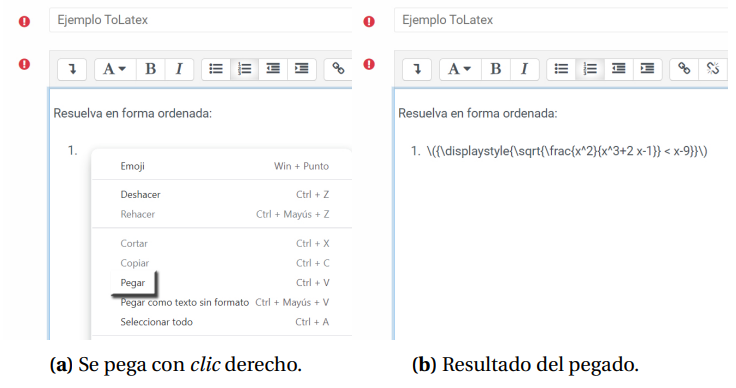 Nota. En adelante no se detallará tanto el proceso de pegado y vista previa (ver Fig. 4) dentro de Moodle cuando se empleen los comandos del paquete “Incrustada”. Independientemente de la sentencia a la cual recurra el usuario, el procedimiento descrito en el ejemplo 1 aplica para cualquier otra instrucción.