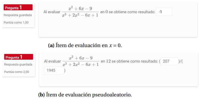 Ejemplo 12. Diseñe en Moodle un ítem donde sobre el conjunto se defina una relación binaria pseudoaleatoria, tal que sí y solo sí se satisface uno de los siguientes criterios:,, ,,,o bien,. La pregunta debe incluir dos respuestas de complete para ingresar un par ordenado de la relación binaria y además, la cantidad de elementos que contiene.