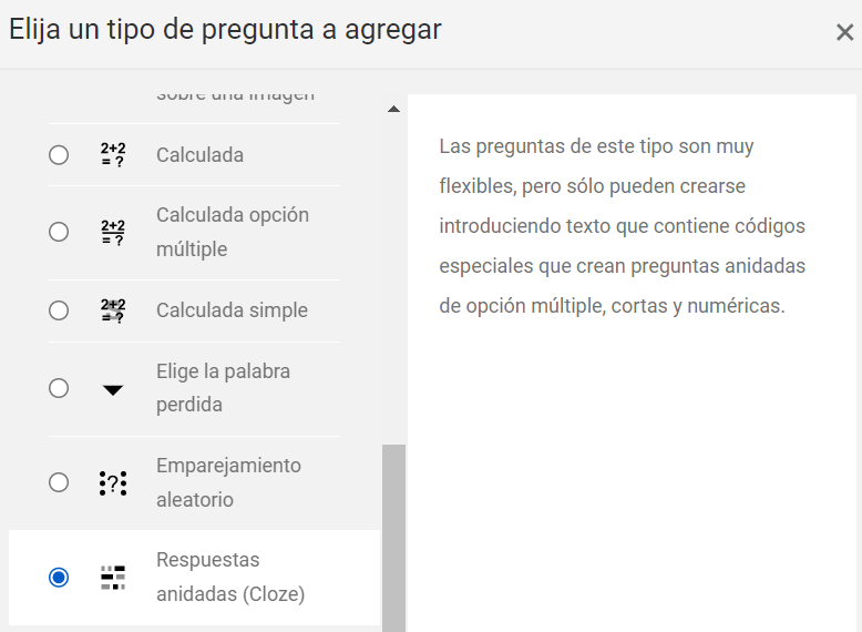 Dentro de la plataforma de aprendizaje y al ingresar a “Banco de preguntas”, se presiona el botón “Crear una nueva pregunta”, esto abre la ventana mostrada en la figura 2, donde se selecciona “Respuestas anidadas (Cloze)”. Posteriormente, se inicia el proceso de edición añadiendo un nombre a la pregunta y el enunciado correspondiente.