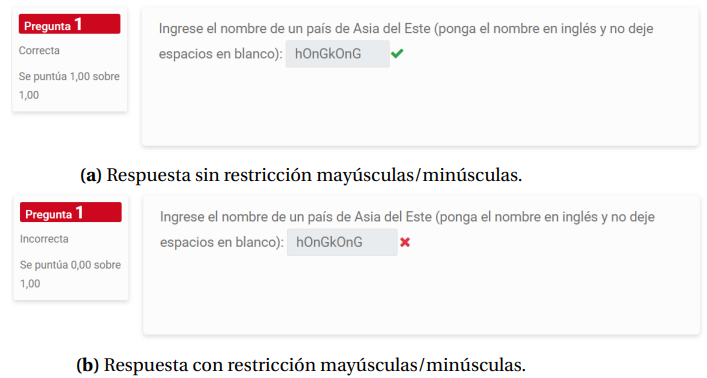 En la subfigura 21.b se visualiza el uso del código anterior. Se observa cómo, en el ítem mostrado por Moodle, el string “hOnGkOnG” ya no es considerado una respuesta válida.