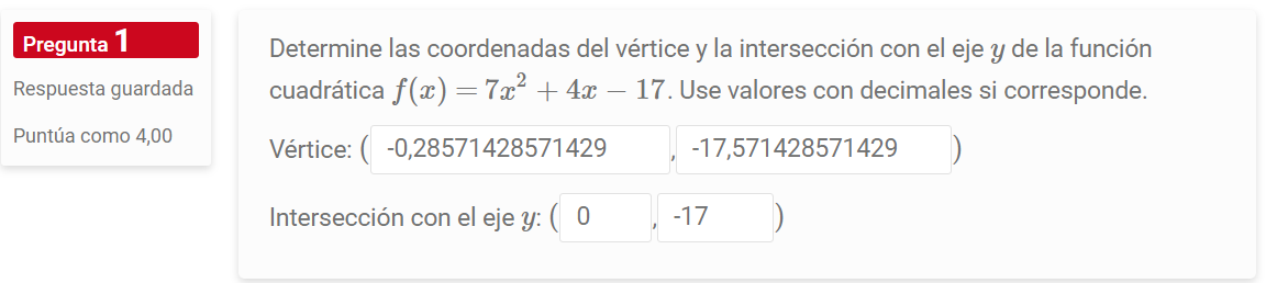 Determine las coordenadas del vértice y la intersección con el eje \({\displaystyle{y}}\) de la función cuadrática \({\displaystyle{f(x)}}\)\({\displaystyle{=}}\)\({\displaystyle{7 x^2+4 x-17}}\). Use valores con decimales si corresponde. Vértice: \({\displaystyle{(}}\){1:NUMERICAL:~=-0.2857142857142857:0.2#Excelente}, {1:NUMERICAL:~=-17.571428571428573:0.2#Excelente}\({\displaystyle{)}}\) Intersección con el eje \({\displaystyle{y}}\): \({\displaystyle{(}}\){1:NUMERICAL:~=0:0#Excelente}, {1:NUMERICAL:~=-17.:0.2#Excelente}\({\displaystyle{)}}\)