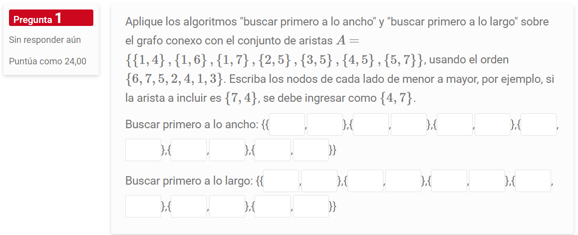 Aplique los algoritmos “buscar primero a lo ancho” y “buscar primero a lo largo” sobre el grafo conexo con el conjunto de aristas \({\displaystyle{A}}\)\({\displaystyle{=}}\)\({\displaystyle{\left\{\left\{{1, 4}\right\},\left\{{1, 6}\right\},\left\{{1, 7}\right\},\left\{{2, 5}\right\},\left\{{3, 5}\right\},\left\{{4, 5}\right\}, \left\{{5, 7}\right\}\right\}}}\), usando el orden \({\displaystyle{\left\{6,7,5,2,4,1,3\right\}}}\). Escriba los nodos de cada lado de menor a mayor, por ejemplo, si la arista a incluir es \({\displaystyle{\left\{7,4\right\}}}\), se debe ingresar como\({\displaystyle{\left\{4,7\right\}}}\). Buscar primero a lo ancho: {{{1:NUMERICAL:~=1:0#Excelente}, {1:NUMERICAL:~=6:0#Excelente}}, {{1:NUMERICAL:~=1:0#Excelente}, {1:NUMERICAL:~=7:0#Excelente}}, {{1:NUMERICAL:~=1:0#Excelente}, {1:NUMERICAL:~=4:0#Excelente}}, {{1:NUMERICAL:~=5:0#Excelente}, {1:NUMERICAL:~=7:0#Excelente}}, {{1:NUMERICAL:~=2:0#Excelente}, {1:NUMERICAL:~=5:0#Excelente}}, {{1:NUMERICAL:~=3:0#Excelente}, {1:NUMERICAL:~=5:0#Excelente}}} Buscar primero a lo largo: {{{1:NUMERICAL:~=1:0#Excelente}, {1:NUMERICAL:~=6:0#Excelente}}, {{1:NUMERICAL:~=1:0#Excelente}, {1:NUMERICAL:~=7:0#Excelente}}, {{1:NUMERICAL:~=5:0#Excelente}, {1:NUMERICAL:~=7:0#Excelente}},{{1:NUMERICAL:~=2:0#Excelente}, {1:NUMERICAL:~=5:0#Excelente}}, {{1:NUMERICAL:~=4:0#Excelente}, {1:NUMERICAL:~=5:0#Excelente}}, {{1:NUMERICAL:~=3:0#Excelente}, {1:NUMERICAL:~=5:0#Excelente}}}