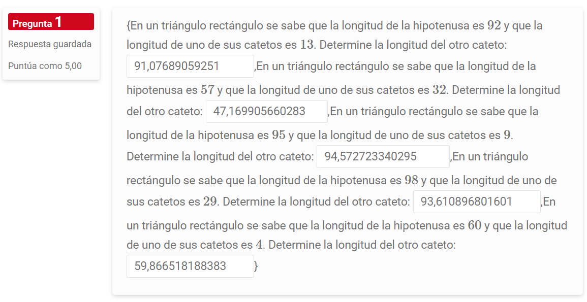 Ejemplo 15. Elabore cinco ítems distintos de respuesta corta numérica, donde en cada uno, al generarse de manera pseudoaleatoria la longitud de la hipotenusa y la longitud de un cateto de un triángulo rectángulo, coloque como opción de respuesta la longitud del cateto faltante, usando una precisión de 0.2.