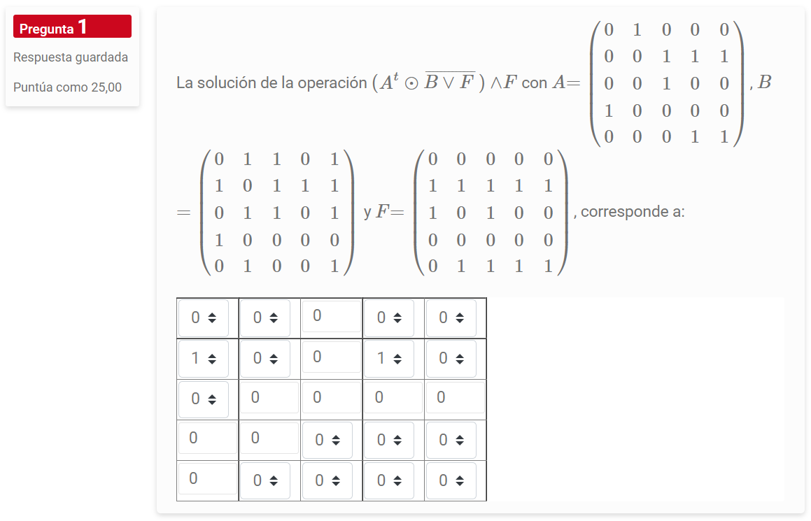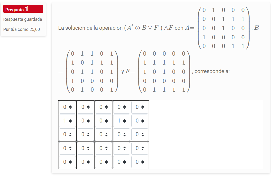 La solución de la operación \({\displaystyle{(}}\)\({\displaystyle{A^t \odot \overline{B \lor F}}}\) \({\displaystyle{)}}\) \({\displaystyle{\land}}\) \({\displaystyle{F}}\) con \({\displaystyle{A}}\)\({\displaystyle{=}}\)\({\displaystyle{\left( \begin{array}{ccccc} 0 & 1 & 0 & 0 & 0 \\ 0 & 0 & 1 & 1 & 1 \\ 0 & 0 & 1 & 0 & 0 \\ 1 & 0 & 0 & 0 & 0 \\ 0 & 0 & 0 & 1 & 1 \\ \end{array} \right) }}\), \({\displaystyle{B}}\)\({\displaystyle{=}}\)\({\displaystyle{\left( \begin{array}{ccccc} 0 & 1 & 1 & 0 & 1 \\ 1 & 0 & 1 & 1 & 1 \\ 0 & 1 & 1 & 0 & 1 \\ 1 & 0 & 0 & 0 & 0 \\ 0 & 1 & 0 & 0 & 1 \\ \end{array} \right) }}\) y \({\displaystyle{F}}\)\({\displaystyle{=}}\)\({\displaystyle{\left( \begin{array}{ccccc} 0 & 0 & 0 & 0 & 0 \\ 1 & 1 & 1 & 1 & 1 \\ 1 & 0 & 1 & 0 & 0 \\ 0 & 0 & 0 & 0 & 0 \\ 0 & 1 & 1 & 1 & 1 \\ \end{array} \right) }}\), corresponde a: