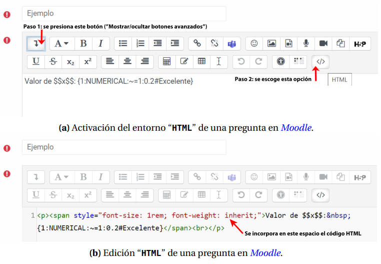 Para ello, se presiona el botón “Mostrar/ocultar botones avanzados” y posteriormente el botón “</>” (“HTML”) con el objetivo de habilitar en el espacio de edición de la pregunta, la escritura de código del lenguaje de marcas de hipertexto.