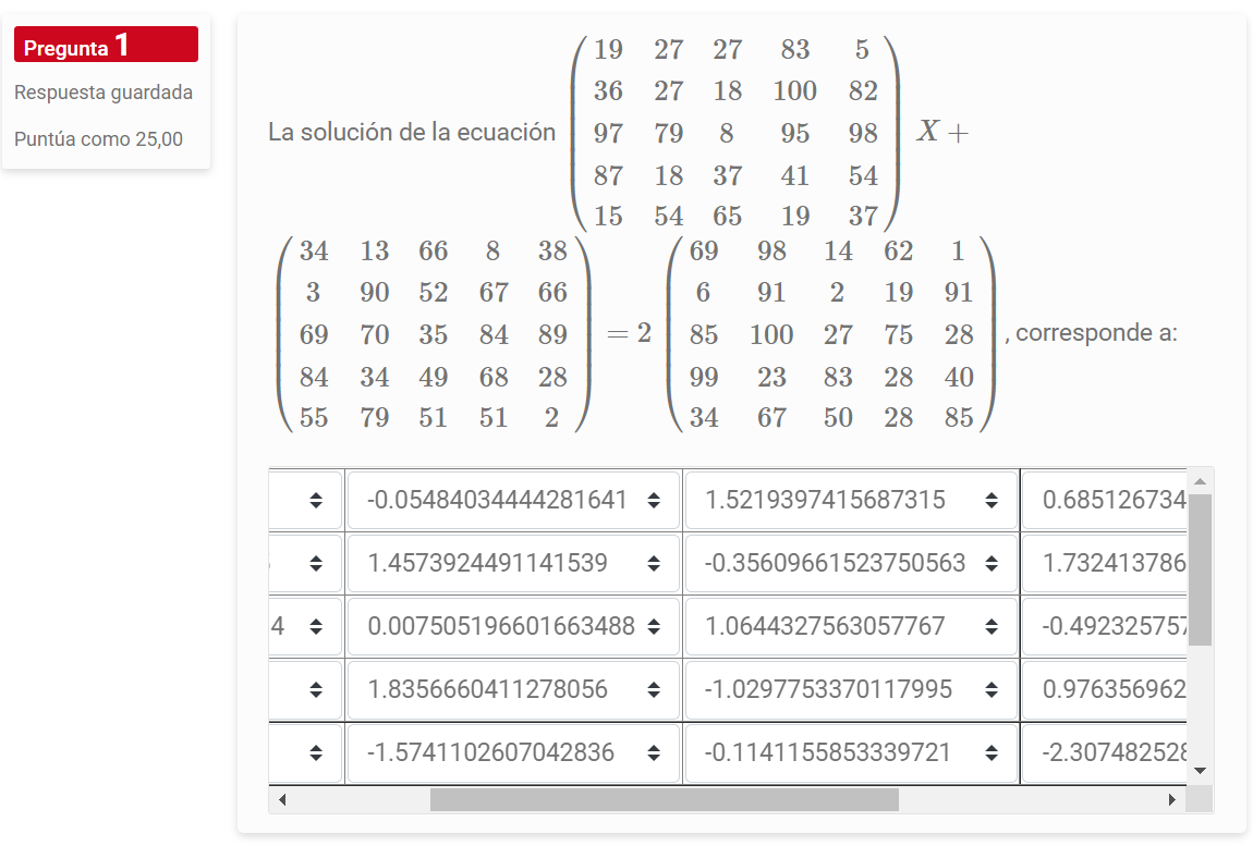 Ejemplo 17 Diseñe una pregunta cloze cuyas opciones de respuesta sean la solución de la ecuación A·X +B = 2F,siendo A, B y F matrices pseudoaleatorias de tamaño 5×5 con entradas enteras en el rango de 1 a 100.
