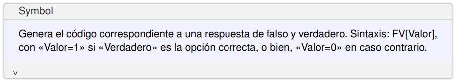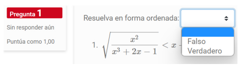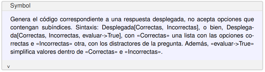 Una respuesta desplegada consiste en un combo de opciones que el alumno tendrá a su disposición para escoger una única posibilidad de contestación. En la figura 6 se mostró, por ejemplo, una respuesta desplegada con un Falso-Verdadero. La construcción de este tipo de pregunta cloze se automatiza utilizando el comando “Desplegada” del paquete “Incrustada”. Explicamos esto en la siguiente ficha: