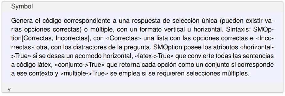 También, es importante señalar que el comando “ShortAnswer” cuando recibe como argumento expresiones donde es posible eliminar espacios en blanco, automáticamente elimina esos espacios y crea éstas nuevas opciones de respuesta, agregándolas a la lista empleada por “ShortAnswer”. En este ejemplo, “ShortAnswer” realizó la eliminación de los espacios en blanco en cada uno de los pares ordenados de la relación binaria obtenidos mediante la instrucción “RelBin” y los incluyó en las opciones de respuesta.