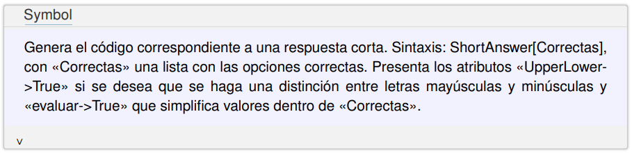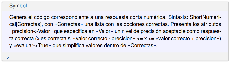 “ShortNumerical” crea el código para una pregunta tipo cloze donde la respuesta es un número, al cuál es factible, definir un grado de precisión. Mathematica nos permite ver la descripción de uso de este comando, mediante la ayuda de la sentencia:
