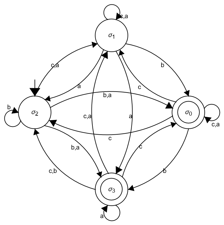 Estados: {s0, s1, s2, s3} Sı́mbolos de entrada: {a, b, c} Estado inicial: s2 Estados aceptados: {s0, s3}