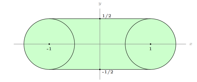 En este trabajo nos interesa la envolvente convexa de los círculos con centro en los puntos (1,0) y (-1,0) y radio (1/2), esta es la región verde mostrada en la figura 1. Observe que el segmento que une al punto (-1,1/2) con (1,1/2) y el que une al punto (-1,-1/2) con (1,-1/2) pertenecen a dicha envolvente convexa.