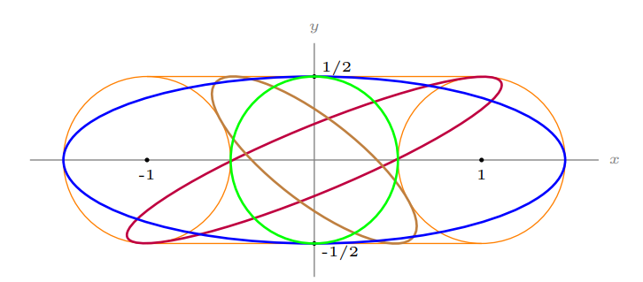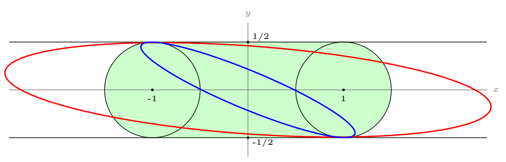 Lema 1. Para , la elipse con ecuación (1) tiene centro en el origen y es tangente al círculo en el punto y al segmento que une el punto (-1,1/2) con (1,1/2) en el punto.