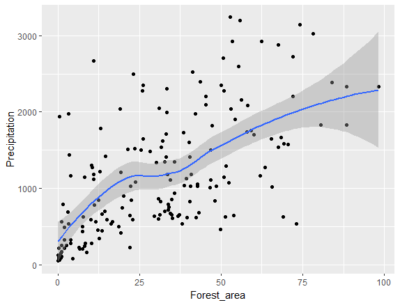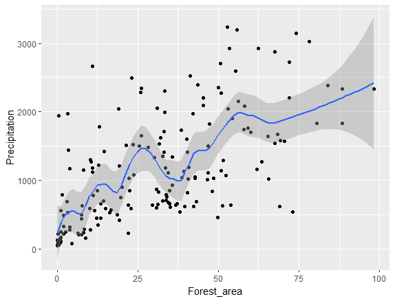 ggplot(data = worldbank, aes(x = Forest_area, y = Precipitation))+ geom_point() + geom_smooth()