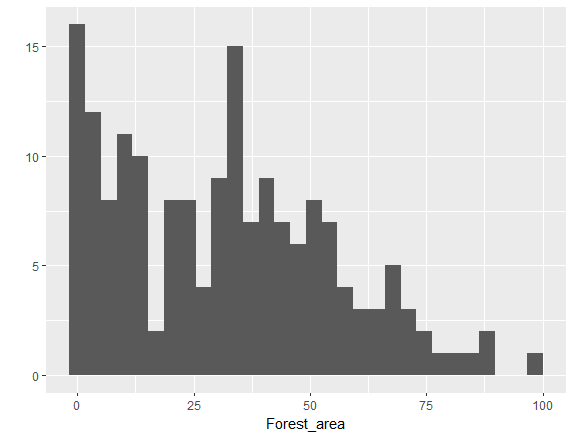 Hasta este momento se tiene la estructura ggplot (datos, aes (x = , y =)), luego, para insertar una nueva capa se utiliza el símbolo "+ ". En el ejemplo anterior se insertó la capa de la geometría, específicamente, se usó puntos (geom_point) para representar el cruce de los valores de las dos variables seleccionadas. Por ejemplo, si se quiere usar la geometría de histograma para la variable Forest_area, la cual tiene una naturaleza continua, se utiliza la geom_histogram y se escribe la siguiente instrucción, la cual permite generar la Figura 2.