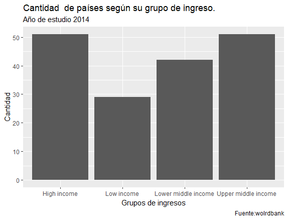 barras + xlab("Grupos de ingresos") + ylab("Cantidad") + labs(title = "Distribución de países según su nivel de ingreso", subtitle = "Año de estudio 2014", caption = "Fuente:wolrdbank")