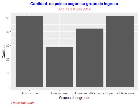 barras + xlab("Grupos de ingresos") + ylab("Cantidad")+ labs(title = "Distribución de países según su nivel de ingreso", subtitle = "Año de estudio 2014", caption = "Fuente:wolrdbank")+ theme(plot.title = element_text(color = "blue", size = 12, face = "bold",hjust = 0.5), plot.subtitle = element_text(color = "#F8766D", hjust = 0.5), plot.caption = element_text(color = "red", face = "italic", hjust = 0))