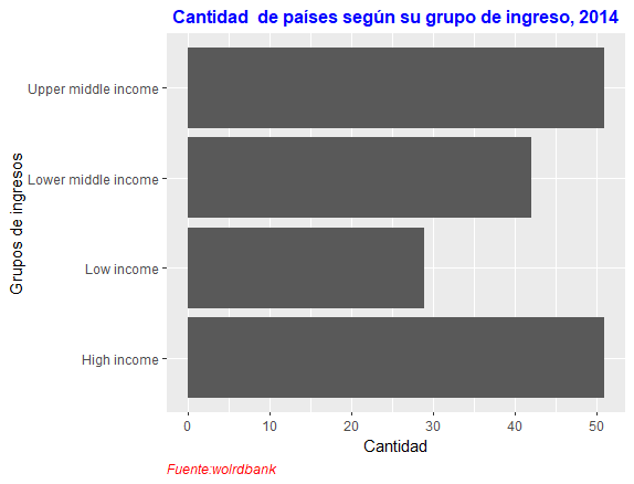 barras + xlab("Grupos de ingresos") + ylab("Cantidad")+ labs(title = "Cantidad de países según su grupo de ingreso.", subtitle = "Año de estudio 2014", caption = "Fuente:wolrdbank")+ theme(plot.title = element_text(color = "blue", size = 12, face = "bold", hjust = 0.5), plot.caption = element_text(color = "red", face = "italic", hjust = 0)) + coord_flip()