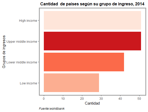 ggplot(worldbank,aes(x=fct_rev(fct_infreq(Income_group)),fill=Income_group))+ geom_bar()+ xlab("Grupos de ingresos")+ ylab("Cantidad")+ labs(title = "Cantidad de países según su grupo de ingreso, 2014",caption = "Fuente:wolrdbank")+ theme( plot.title = element_text(size = 12, face = "bold",hjust = 0.5), plot.caption = element_text(face = "italic",hjust = 0), panel.background = element_rect(fill = "white"), panel.border = element_rect(fill = "transparent",color = 8, size = 2), legend.position = "none")+ coord_flip()+ scale_fill_brewer(palette="Reds")