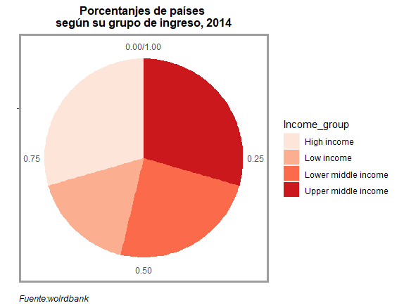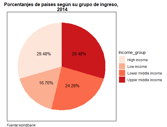 ggplot(ig, aes(x = "", y = prop, fill = Income_group)) + geom_bar(stat = "identity") + labs(title = "Porcentanjes de países \n según su grupo de ingreso, 2014", caption = "Fuente: wolrdbank") + theme_void() + theme(plot.title = element_text(size = 12, face = "bold", hjust = 0.5), plot.caption = element_text(face = "italic", hjust = 0), panel.background = element_rect(fill = "white"), panel.border = element_rect(fill = "transparent", color = 8, size = 2))+ xlab(NULL) + ylab(NULL) + coord_polar("y") + scale_fill_brewer(palette = "Reds") + geom_text(aes(label = paste0(round(prop*100), "%")), position = position_stack(vjust = 0.5))