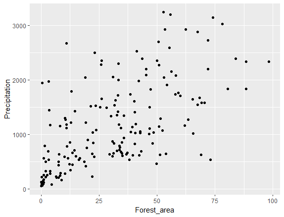 Por ejemplo, usando la base worldbank se pueden visualizar las variables Forest_area y Precipitation por medio de un diagrama de dispersión (ver Figura 1).