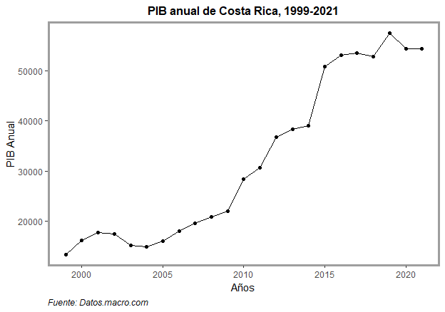 ggplot(data = PIB_CR_Esp, aes(x = Años, y = PIB_anual_CR)) + geom_line() + geom_point() + xlab("Años") + ylab("PIB Anual") + labs(title = "PIB anual de Costa Rica, 1999-2021", caption = "Fuente: Datos.macro.com")+ theme(plot.title = element_text(size = 12, face = "bold", hjust = 0.5), plot.caption = element_text(face = "italic", hjust = 0), panel.background = element_rect(fill = "white"), panel.border = element_rect(fill = "transparent", color = 8, size = 2), legend.position = "none")