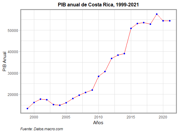 ggplot(data = PIB_CR_Esp, aes(x = Años, y = PIB_anual_CR)) + geom_line(color = "red", size = 0.7) + geom_point(color = "blue") + xlab("Años") + ylab("PIB Anual") + labs(title = "PIB anual de Costa Rica, 1999-2021", caption = "Fuente: Datos.macro.com") + theme_light() + theme(plot.title = element_text(size = 12, face = "bold", hjust = 0.5), plot.caption = element_text(face = "italic", hjust = 0), panel.background = element_rect(fill = "white"), panel.border = element_rect(fill = "transparent", color = 8, size = 2), legend.position = "none")
