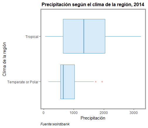 ggplot(worldbank, aes(Precipitation, Climate_region)) + geom_boxplot(color = "#5499c7", fill = "#D6eaf8", outlier.color = "#f5b7b1")