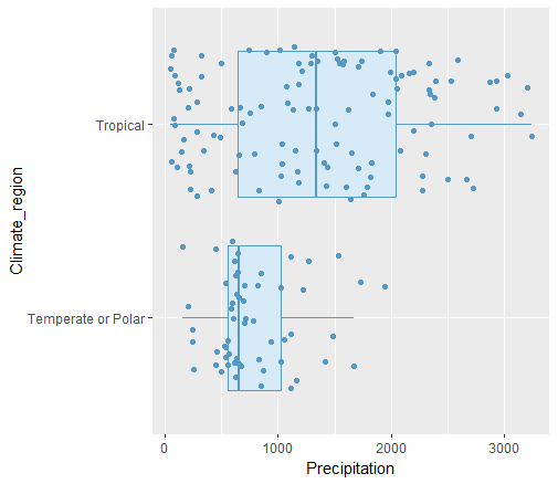 ggplot(worldbank, aes(Precipitation, Climate_region)) + geom_boxplot(color = "#5499c7", fill = "#D6eaf8", outlier.shape = NA) + geom_jitter(width = 0.1, color = "#5499c7")