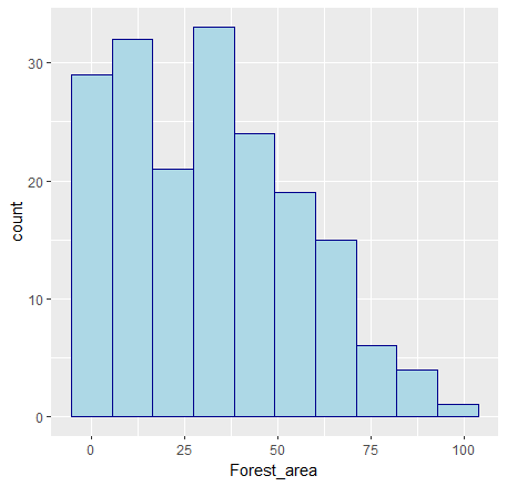 ggplot(data = worldbank, aes(x = Forest_area)) + geom_histogram(bins = 10, color = "darkblue", fill = "lightblue")